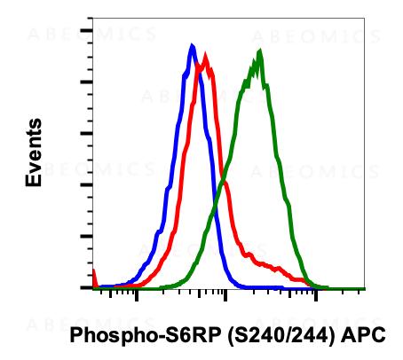 Fig-1: Flow cytometric analysis of K562 cells, untreated and unstained as negative control (blue) or untreated (red) or treated with EGF (green), and stained using Phospho-S6 ribosomal protein (Ser240/Ser244) antibody S6S240S244-CD10 APC conjugate.