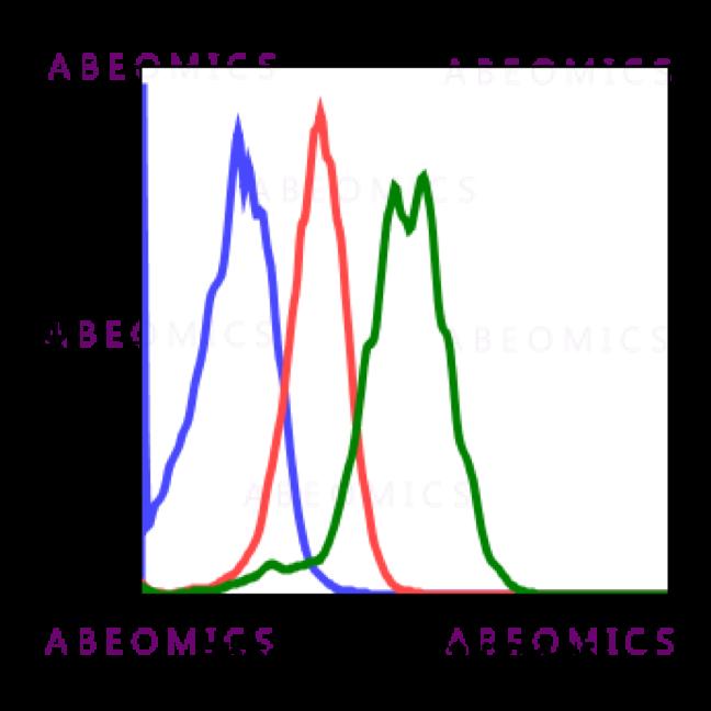 Fig-1: Flow cytometric analysis of U937 cells secondary antibody only negative control (blue) or untreated (red) or treated with IFNa IL-4 and pervanadate (green) using Phospho-Ship2 (Tyr1135) antibody Ship2Y1135-1D2 at 0.5µg/mL.