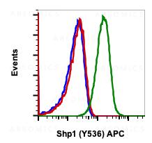 Fig-1: Flow cytometric analysis of Ramos cells unstained as negative control (blue) or untreated (red) or treated with pervanadate (green) and stained using Phospho-Shp1 (Tyr536) antibody Shp1Y536-2A7 APC conjugate.