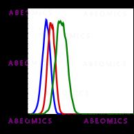 Fig-1: Flow cytometric analysis of U937 cells unstained cells negative control (blue) or untreated (red) or treated with IFNa IL4 and pervanadate (green) using phospho-Shp2 (Tyr580) FITC conjugated antibody Shp2Y580-4A2.