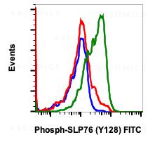 Fig-1: Flow cytometric analysis of Ramos cells unstained untreated cells as negative control (blue) or untreated (red) or treated with pervanadate (green) and stained using phospho-SLP-76 (Tyr128) antibody SLP76Y128-3F8 FITC conjugate.
