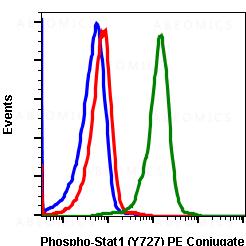 Fig-1: Flow cytometric analysis of U937 cells unstained untreated cells as negative control (blue) or stained untreated (red) or treated with IFNa IL-4 and pervanadate (green) using Phospho-Stat1 (Ser727) antibody Stat1S727-C6 PE conjugate.
