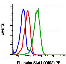 Fig-1: Flow cytometric analysis of K562 cells unstained imatinib treated cells negative control (blue) or stained treated with imatinib (red) or treated with IFNa + IL-4 + pervanadate (green) using phospho-Stat4 (Tyr693) antibody Stat4Y693-F6 PE conjugate.