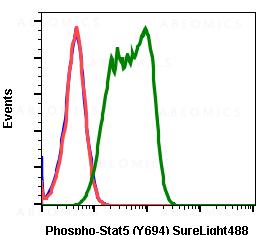 Fig-1: Flow cytometric analysis of NIH3T3 cells unstained and treated with imatinib as negative control (blue) or stained and treated with imatinib (red) or treated with pervanadate (green) using Phospho-Stat5 (Tyr694) antibody Stat5Y694-G11 SureLight488 conjugate.