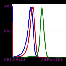 Fig-1: Flow cytometric analysis of U937 cells secondary antibody only negative control (blue) or untreated (red) or treated with IFNa and IL-4 (green) using 0.1 µg/mL Phospho-Stat6 (Tyr641) antibody Stat6Y641-G12.