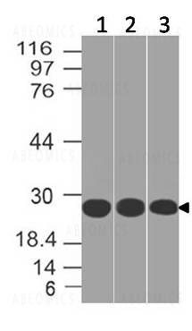 Figure-1: Western blot analysis of 14-3-3. Anti-14-3-3 antibody (11-1048) was used at 1 µg/ml on (1) MOLT-4, (2) A431 and (3) MCF-7 lysates.
