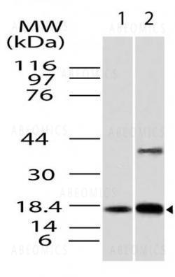 Fig-1: Western blot analysis of ACP 1 isoform C. Anti- ACP 1 isoform C antibody (11-8020) was used at 2 µg/ml on 1) Hela and 2) HepG2 lysates.
