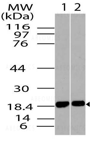 Fig-1: Western blot analysis of ACP1 isoform B. Anti- ACP1 isoform B antibody (11-8019) was used at 1 µg/ml on 1) HepG2 and 2) Hela lysates.