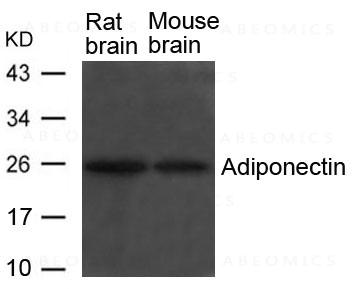 Figure 1: Western blot analysis of extracts from Rat and Mouse brain tissue using Adiponectin Antibody 35-1833 .