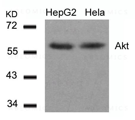 Figure 1: Western blot analysis of extracts from HepG2 and Hela cells using Akt(Ab-308) Antibody 35-1409 .