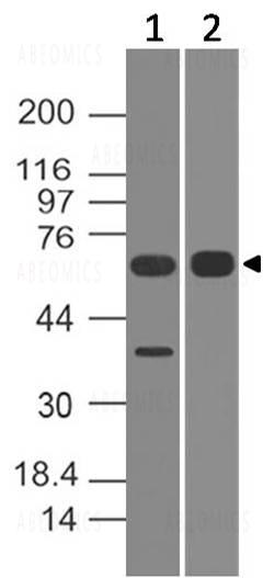Fig-1: Western blot analysis of ALAS1. Anti-ALAS1 antibody (11-10045) was used at 2 µg/ml on (1) h Liver and (2) h Stomach lysates.