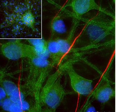 Figure 1: Mixed neuron-glial cultures stained with rabbit antibody to alpha-II spectrin (green) and mouse polyclonal antibody to Nestin (red). The alpha-II spectrin antibody stains numerous axonal and dendritic profiles in these cultures, clearly revealing the submembraneous cytoskeleton. Since alpha-II spectrin is specific for neurons in the CNS, the glial cells in this culture are not recognized by this antibody.