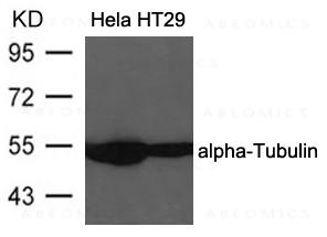 Figure 1: Western blot analysis of extracts from Hela and HT29 cells using alpha-Tubulin Antibody 35-1765 .