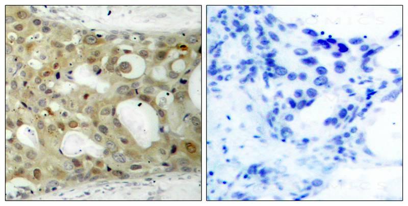 Figure 1: Immunohistochemical analysis of paraffin-embedded human breast carcinoma tissue using Androgen Receptor (Phospho-Ser650) Antibody 35-1117 (left) or the same antibody preincubated with blocking peptide 51120 (right).