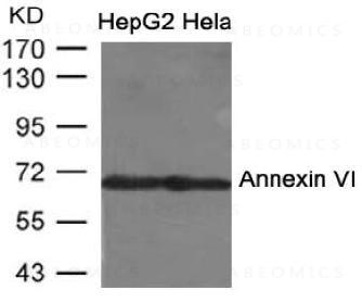 Figure 1: Western blot analysis of extracts from HepG2 andd Hela cells us ing Annexin VI Antibody 35-1840 .