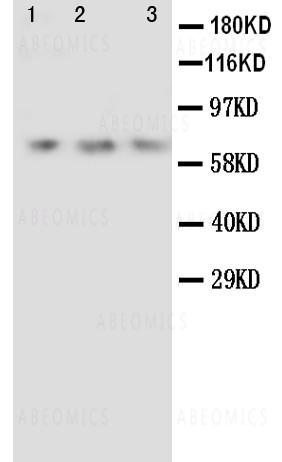 Figure 1: Anti-Angiopoietin 2 antibody(39-2016). Western blotting: Lane 1: Recombinant Human ANG2 Protein 10ng, Lane 2: Recombinant Human ANG2 Protein 5ng. Lane 3: Recombinant Human ANG2 Protein 2.5ng.