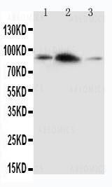 Figure 1: Anti-APLP2 antibody(39-2123). Western blotting: Lane 1: Rat Brain Tissue Lysate, Lane 2: Rat Heart Tissue Lysate, Lane 3: SMMC Cell Lysate.