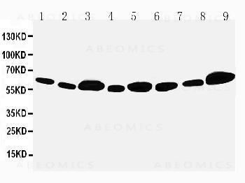 Figure 1: Anti-Apoptosis inhibitor 5 antibody(39-2021). Western blotting: Lane 1: Rat Cardiac Muscle Tissue Lysate, Lane 2: Rat Brain Tissue Lysate, Lane 3: Rat Testis Tissue Lysate, Lane 4: Rat Placenta Tissue Lysate, Lane 5: MCF-7 Cell Lysate, Lane 6: HELA Cell Lysate, Lane 7: CEM Cell Lysate, Lane 8: SMMC Cell Lysate, Lane 9: COLO320 Cell Lysate.