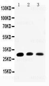 Figure 1: Anti-Aquaporin 1 antibody(39-2022). Western blotting: Lane 1: Rat Kidney Tissue Lysate, Lane 2: Rat Lung Tissue Lysate, Lane 3: SMMC Cell Lysate.