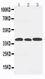 Figure 1: Anti-CCR5 antibody(39-2030). Western blotting: Lane 1: Mouse Lung Tissue Lysate, Lane 2: Mouse Intestine Tissue Lysate, Lane 3: Mouse Kidney Tissue Lysate.