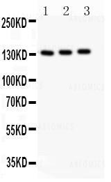 Figure 1: Anti-eNOS antibody(39-2130). Western blotting: Lanes: Anti eNOS at 0.5ug/ml, Lane 1: HELA Whole Cell Lysate at 40ug, Lane 2: HEPG2 Whole Cell Lysate at 40ug , Lane 3: COLO320 Whole Cell Lysate at 40ug. Predicted band size: 133 kDa: Observed band size: 133 kDa.