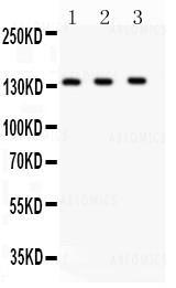 Figure 1: Anti-JAK1 antibody(39-2122). Western blotting: Lanes: Anti JAK1(39-2122)) at 0.5ug/ml with Lane 1: U87 Whole Cell Lysate at 40ug, Lane 2: MM231 Whole Cell Lysate at 40ug, Lane 3: SW620 Whole Cell Lysate at 40ug. Predicted band size: 133 kDa. Observed band size: 133 kDa.