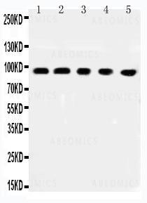 Figure 1: Anti-MCC antibody(39-2151). All Western blotting: All Lanes: Anti-MCC(39-2151) at 0.5ug/ml. Lane 1: Rat Brain Tissue Lysate at 40ug, Lane 2: 293T Whole Cell Lysate at 40ug, Lane 3: NIH Whole Cell Lysate at 40ug, Lane 4: A549 Whole Cell Lysate at 40ug, Lane 5: HEPG2 Whole Cell Lysate at 40ug. Predicted band size: 93 kDa.Observed band size: 93 kDa.