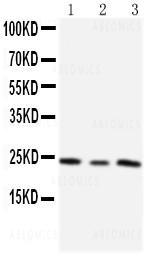 Figure 1: Anti-TIMP4 antibody(39-2065). Western blotting : Lane 1: HT1080 Cell Lysate , Lane 2: HELA Cell Lysate, Lane 3: SMMC Cell Lysate.