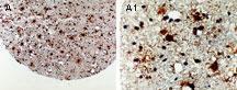 Fig:1 Formalin-fixed, paraffin-embedded tissue core of human glioma (grade II) stained for Apaf 1 expression using 20-1002 at 1:2000. A and A1. Low and high magnification, respectively Hematoxylin-eosin counterstain.