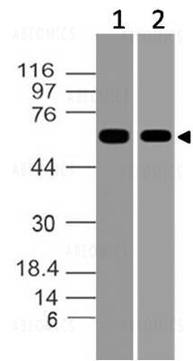 Figure-1: Western blot analysis of Asb-2. Anti-Asb-2 antibody (11-8110) was used at 0.5 µg/ml on (1) HepG2 and (2) K562 lysates.