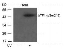 Figure 1: Western blot analysis of extracts from Hela cells untreated or treated with UV using ATF4(Phospho-Ser245) Antibody 35-1052 .