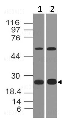 Fig-1: Western blot analysis of B7-H4, mouse. Anti-B7-H4, mouse antibody (11-7575) was used at 2 µg/ml on (1) EL-4 and 0.5 µg/ml on (2) Recombinant lysates.