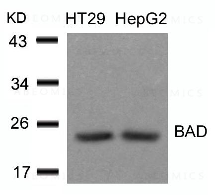 Figure 1: Western blot analysis of extracts from HT29 and HepG2 cells using BAD(Ab-136) Antibody 35-1417 .
