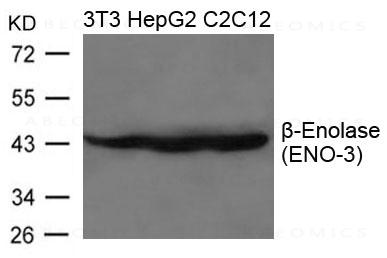 Figure 1: Western blot analysis of extracts from 3T3, HepG2 and C2C12 cells using b-Enolase(ENO-3) Antibody 35-1824 .