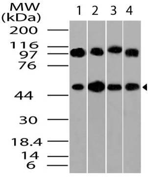 Figure-1: Western blot analysis of Beta Tubulin. Anti- Beta Tubulin antibody (11-13002) was used at 4 µg/ml on 1) A431, 2) Hela, 3) MCF7 and 4) 3T3 lysates.
