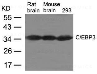 Figure 1: Western blot analysis of extracts from Rat brain, Mouse brain tissue and 293 cells using C/EBPb Antibody 35-1843 .