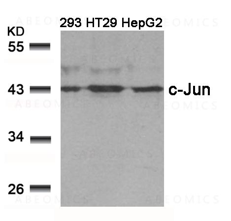Figure 1: Western blot analysis of extracts from 293, HT29 and HepG2 cells using c-Jun(Ab-239) Antibody 35-1381 .