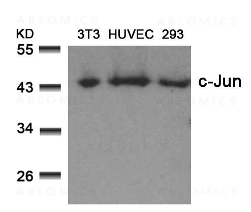 Figure 1: Western blot analysis of extracts from 3T3, HUVEC and 293 cells using c-Jun(Ab-73) Antibody 35-1361 .