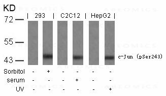 Figure 1: Western blot analysis of extracts from sorbitol-treated 293, Serum-treated C2C12 and UV-treated HepG2 cells using c-Jun(Phospho-Ser243) Antibody 35-1024 .