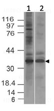 Figure-1: Western blot analysis of Caspase-3 (active/cleaved). Anti-Caspase-3 (active/cleaved) antibody (38-1040) was used at 1 µg/ml on (1) Jurkat and (2) MCF-7 lysates.
