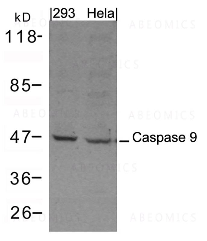 Figure 1: Western blot analysis of extracts from 293 and Hela cells using Caspase 9 Antibody 35-1676 .