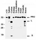 Fig:1 Western blot analysis of Caspase-9. Various tissue lysates were prepared from human autospsy material and normalized for total protein. Most tissues contained the ~50 kDa pro-Caspase-9 protein. Cleaved Caspase-9 was identified in brain cortex and peripheral nerve tissue samples. Pro-C9: recombinant human pro-Caspase-9 (full-length) protein. PRO: pro-Caspase-9. L: large subunit of cleaved Caspase-9. S: small subunit of cleaved Caspase-9.