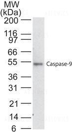 Apoptosis, or programmed cell death, is a common property of all multicellular organisms. The current dogma of apoptosis suggests that the components of the core cell-death machinery are integral to cells and widely conserved across species. Caspases, a family of cysteinyl aspartate-specific proteases, are integral components of the cell death machinery (reviewed in Siegal, 2006; and Lavrik et al, 2005). They play a central role in the initiation and execution of apoptotic cell death and in inflammation. Caspases are typically divided into 3 major groups, depending on the structure of their prodomain and their function. Group 1: inflammatory caspases (caspases 1, 4, 5, 11, 12, 14). Group II: initiator of apoptosis caspases (caspases 2, 8, 9). Group II: effector caspases (caspases 3, 6, 7). Caspases are synthesized as zymogens (inactive pro enzyme precursors which require a biochemical change to become active enzymes) with an N-terminal prodomain of variable length followed by a large subunit (p20) and a small subunit (p10). Caspases are activated through proteolytic cleavage at specific asparagine residues that are located within the prodomain, the p10, and p20 subunits. Activation results in the generation of mature active caspases that consist of the heterotetramer p202-p102. Active caspases mediate cell death and inflammation through cleavage of particular cellular substrates that are involved in these processes. The Caspase-9 polyclonal antisera recognizes the pro form of caspase-9 (approx. 50 kDa), and the large (approx. 35 kDa) subunit (with pro-domain sequences) of active/cleaved Caspase-9. It does not recognize the small (approx. 15 kDa) subunit of active/cleaved Caspase-9.