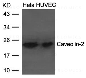 Figure 1: Western blot analysis of extracts from Hela and HUVEC cells using Caveolin-2 Antibody 35-1855 .