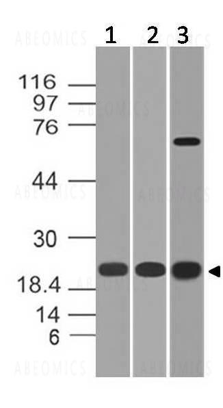 Figure-1: Expression analysis Cbx5. Anti-Cbx5 antibody (11-12009) was used at 2 µg/ml on (1) Jurkat, (2) MCF-7 and (3) EL-4 lysates.
