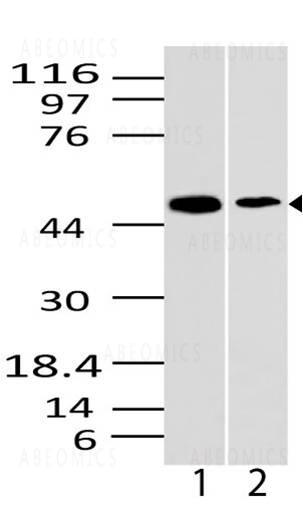 Fig-1: Western blot analysis of CD209. Anti-CD209 antibody (11-4057) was used at 2 µg/ml on 1) U937 and 2) Jurkat lysates.