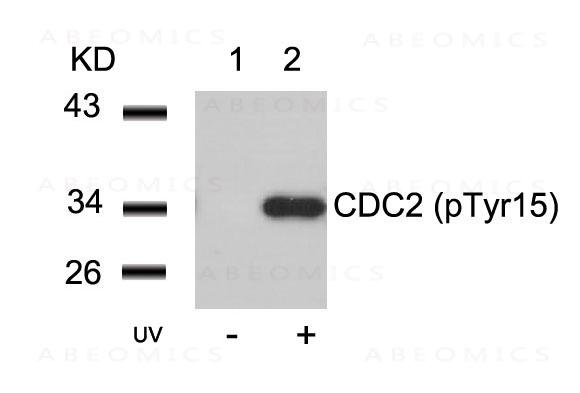 Figure 1: Western blot analysis of extracts from Hela cells untreated(lane 1) or treated with UV(lane 2) using CDC2(Phospho-Tyr15) Antibody 35-1226 .