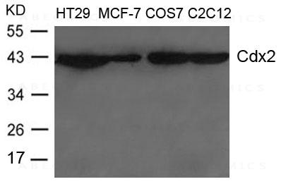 Figure 1: Western blot analysis of extracts from HT-29, MCF-7, COS-7 and C2C12 cells using Cdx2 Antibody 35-1812 .