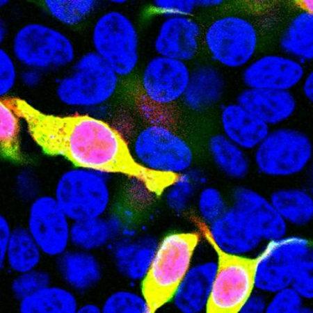 Figure-1: Immunofluorescent analysis of HEK293 cells transfected with mCherry-HA, construct, in red, and stained with rabbit pAb to mCherry,(34-1024), dilution 1:1,000, in green. The blue is Hoechst staining of nuclear DNA. (34-1024) antibody reveals mCherry protein expressed only in transfected cells which appear golden in color. Untransfected cells do not react with the antibody, as a result only their nuclei are visible.