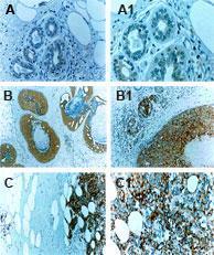 Fig:1 Immuhistochemical analysis of formalin-fixed, paraffin-embedded human breast tissue using 20-1055 at 1:2000. A, normal breast tissue. B, ductal carcinoma in situ (DCIS). C, invasive breast carcinoma. A1, B1, and C1 are higher magnifications of A, B and C, respectively. Hematoxylin-eosin counterstain. Increased cIAP1 expression is seen in the cancerous compared to normal breast tissue. Hematoxylin-eosin counterstain
